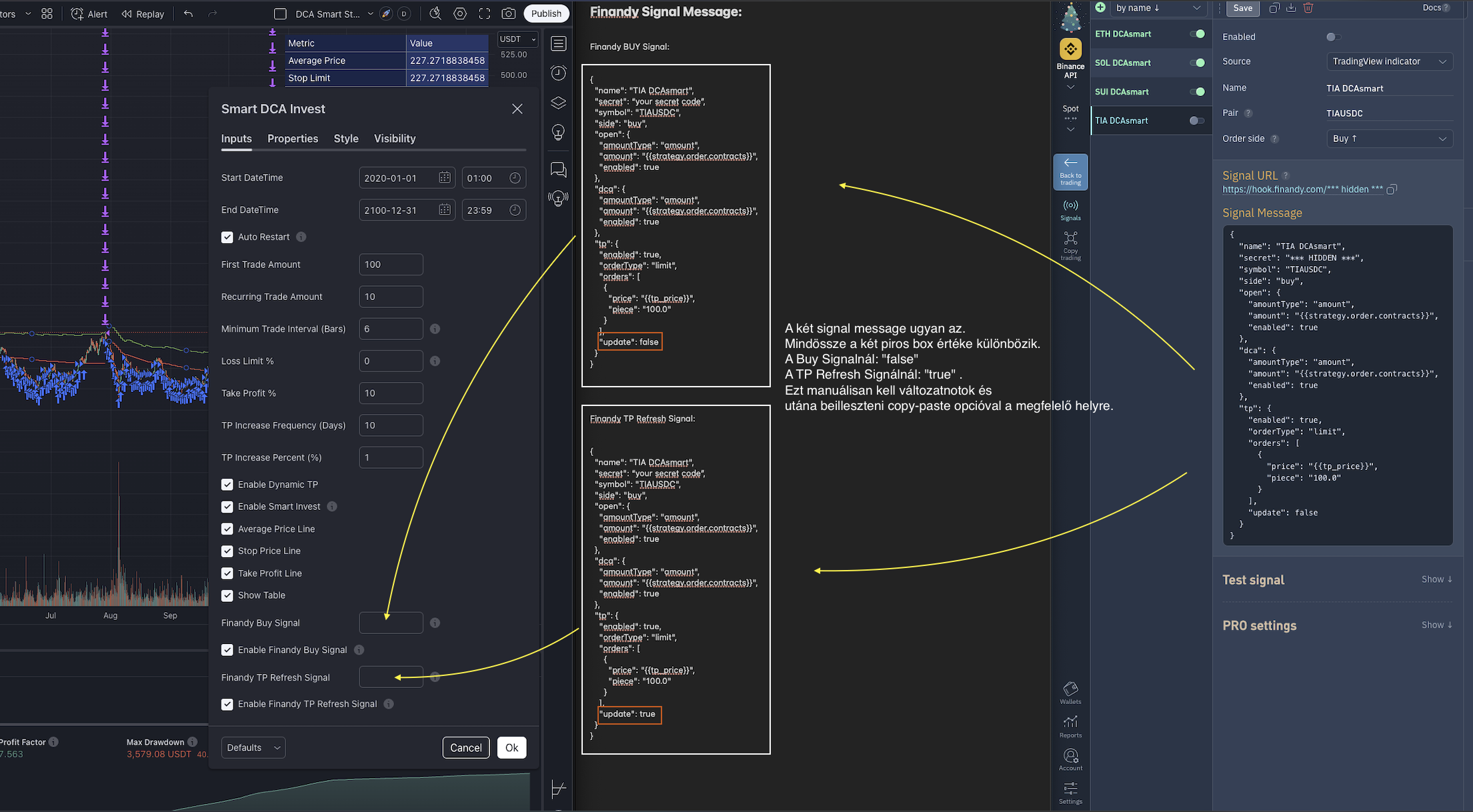 A Dinamikus Take Profit (TP) funkció lehetővé teszi, hogy a stratégia alkalmazkodjon a piaci körülményekhez, és idővel növelje a profitcélt. Ezáltal optimalizálható a hozam, különösen hosszabb távú pozíciók esetén. Emellett a Smart Invest mechanizmus biztosítja a kimaradt vásárlások hatékony kezelését és a befektetési stratégia folyamatos optimalizálását.